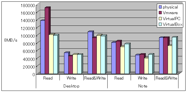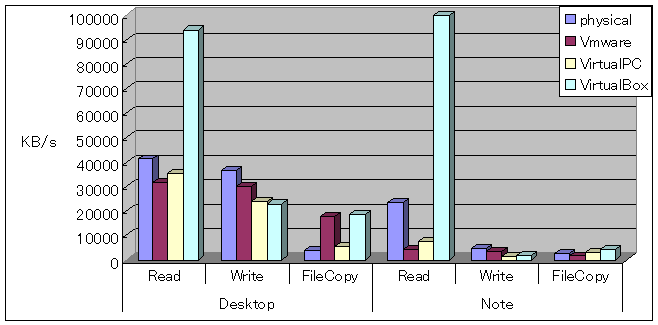 リード、ライト、コピーの1秒間の転送バイト(KByte/s)を測ります。使用容量はデフォルトで100MByteになっています。コピーは64KByteのファイルを連続コピーしたときの転送速度です。DISK測定はDISKキャッシュを切って測定していますので,通常使用時よりも高い数値が出ます。